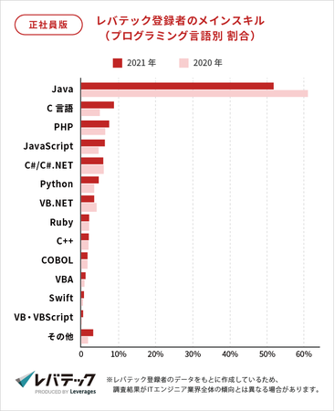 レバテック登録者のメインスキルの割合は、トップがJavaの51.9%、次いでC言語8.8%、PHPが7.6%という結果になりました。圧倒的なシェアを占めるJava割合ですが、前年比で見ると、9.2ポイント下落しています。