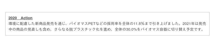 2025年までに定番ラインの40%以上*にてバイオマス容器を使用し、2030年までに、全商品容器・セット箱・販促物・梱包材全てにおいて、環境に配慮したプラスチック素材を使用し、可能な範囲で紙素材への置き換えを推進します。