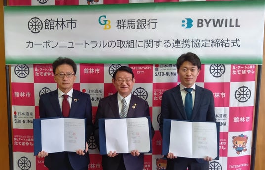 「GXをやりたくなる世界」を目指し、環境価値を活用した経済循環を推進する株式会社バイウィル(本社:東京都中央区、代表取締役社長:下村 雄一郎、以下「バイウィル」)は、群馬県館林市(市長:多田 善洋、以下「館林市」)、株式会社群馬銀行(本店:群馬県前橋市、代表取締役 頭取:深井 彰彦、以下「群馬銀行」)と、「カーボンニュートラルの取組に関する連携協定」を締結しました。