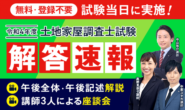 アガルートアカデミーでは、令和4年度(2022年)土地家屋調査士試験の「解答速報」「総評動画」「午後記述問題解説動画」「YouTube座談会」を会員登録不要で本日無料公開いたします。