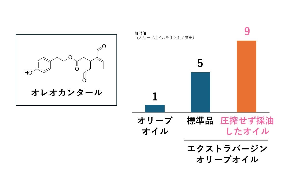 成分分析を行った結果、エクストラバージンオリーブオイル※1には通常のオイルに比べてオレオカンタールが5倍以上多く含まれていることが分かりました。また、圧搾せず採油したオイルには、さらに多くのオレオカンタールが含まれていることを新たに見出しました。
