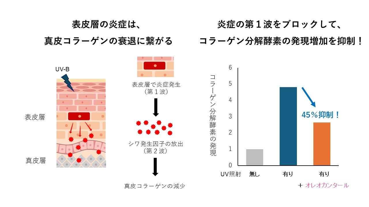 表皮角化細胞においてインフラマソームが誘導する炎症を、オレオカンタールが強く抑制することを発見しました。その効果はよく知られた抗炎症成分グリチルリチン酸の炎症阻害率(16%)を超える73%と顕著でした。さらに、紫外線を照射した表皮角化細胞の培地を真皮線維芽細胞に添加したところ、コラーゲン分解酵素MMP-1の発現増加が確認されましたが、オレオカンタールを添加した表皮角化細胞の培地は、このMMP-1発現増加が45%抑制されることを新たに発見しました。これにより、コラーゲン分解酵素の発現増加を抑制することを明らかにしました。