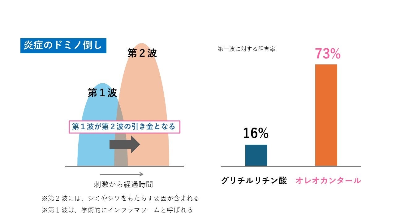 紫外線により表皮層で生じる炎症の“第一波”が真皮層にも及び、コラーゲン減少や肌老化を招くことは既に知られています。近年、この“第一波”のメカニズムにインフラマソームと呼ばれる炎症の発生装置が関与していることが明らかになりました。しかし、このインフラマソームの活性化を抑える天然成分はこれまで、報告されていませんでした。