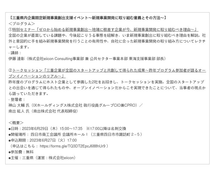 eiiconは、三重県「TOKOWAKA-MIE事業共創推進事業」運営業務を昨年に続き受託。今年度も三重県のオープンイノベーションを加速させます!