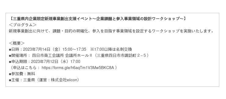 三重県内事業者を対象に開催する、新規事業創出セミナー及びワークショップの参加者を募集いたします。
