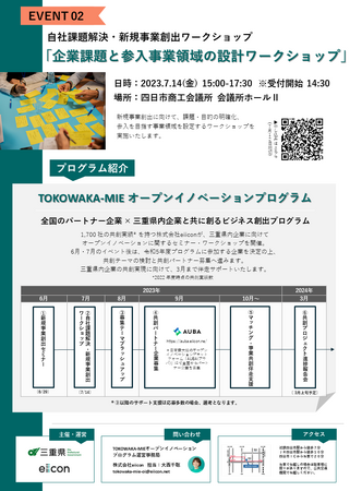 日本最大級のオープンイノベーションプラットフォーム「AUBA(アウバ)」を運営する株式会社eiicon(エイコン 本社所在地:東京都港区虎ノ門、代表取締役社長:中村 亜由子、以下「eiicon」)は、三重県「TOKOWAKA-MIE事業共創推進事業(以下、本事業)」の核となる取り組みとして、三重県内事業者と全国のパートナー企業によるビジネス創出を目的とするプログラム(以下、本プログラム)の始動、ならびに本プログラムの取組として、県内事業者を対象に、事業共創に向けて必要なポイント・ノウハウをレクチャーする全2回のセミナー/ワークショップイベントを開催します。