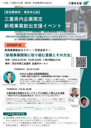 本事業は、三重県内におけるイノベーションを促進し、三重県経済の持続的な発展につなげるために、先進的な技術・ノウハウを持つスタートアップとの連携に向けた県内事業者の機運を広く醸成するとともに、県内事業者による他社との事業共創への具体的な取組を促進することによって、令和4年度に着手し動き出した三重県におけるオープンイノベーションの流れを定着・加速させることを目指すものです。