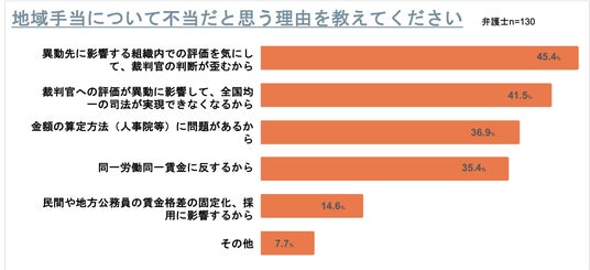 続いて多かったのが「全国均一の司法が実現できなくなるから」で41.5%でした。組織にとって都合の良い裁判官が地域手当の高い勤務地に配属されるなどして、裁判官の能力に地域差が出ているのではないかと危惧している弁護士が多いようです。