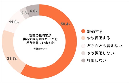 現職の裁判官が実名で国を訴えたことについての賛否を問うたところ、「評価する」「やや評価する」が80.1%となり、弁護士の多くが竹内判事の提訴を好意的に見ていることが分かりました。
