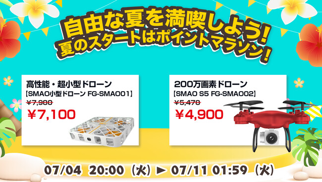 楽天市場「Show !t」は7月4日(火)20時からトイドローンをお得な10%オフセール価格で販売します。トイドローンを私有地で使って、運転操作や動画や静止画を上空から撮影し、操作を楽しんでみましょう。また、7月4日(火)20:00~7月11日(火)01:59まで開催される、楽天お買い物マラソンに参加し、全商品ポイント10倍プレゼント(一部商品を除く)を実施します。