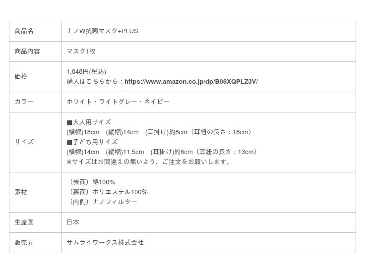 サムライワークス株式会社(代表取締役社長:新島 実 本社所在地:東京都渋谷区)は、一般的な不織布マスクよりも高いウイルス捕集力を持ち、医療用レベルで飛沫防止ができる『ナノW抗菌マスク』をさらに進化させた「ナノW抗菌マスク+PLUS」をamazonで販売開始!さらに特別価格として2,508円のところ1,848円(税込)にて提供いたします。