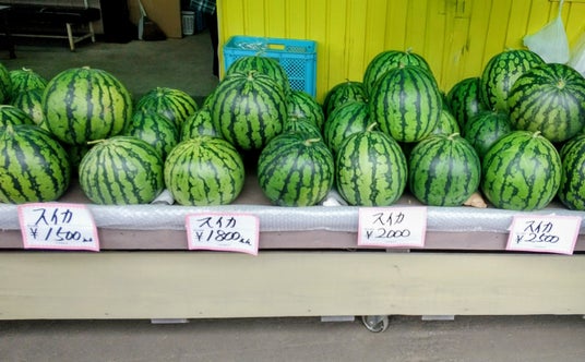 店頭に並ぶスイカの鮮やかな緑から、情感たっぷりに夏の季節感と、生活に溶け込んだ自然の恵みを感じられます。日常の買い物の中で、金額設定が違うスイカに興味を持って面白がる投稿者の方の感覚に、身近な楽しさを発見するのが上手な人の暮らしの豊かさが表れています。