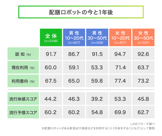 「配膳ロボット」の「流行予想スコア」は全体で「60.2」で、およそ2人に1人が1年後に利用していそうというイメージ。現在の流行体感から比較すると、1年後には今の1.4倍浸透しているというイメージになります。