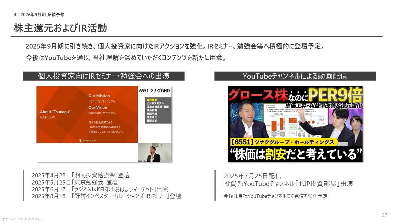 2025年9月期に引き続き、個人投資家に向けたIRアクションを強化していきます。