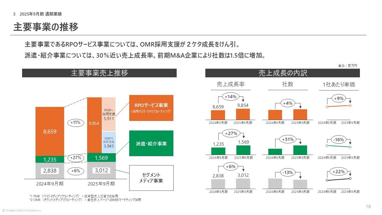 主要事業であるRPOサービス事業については、オウンドメディアリクルーティング採用支援が2ケタ成長をけん引。派遣・紹介事業については、30%近い売上成長率で前期M&A企業により社数は1.5倍に増加しました。