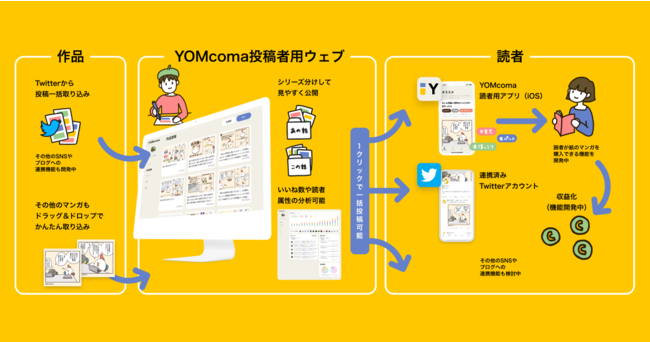 「YOMcoma」は、ショートマンガを創作するクリエイターひとりひとりの「なりたい姿」を応援し、「困りごと」の解決を目指すサービスです。「YOMcoma」は、クリエイターが利用するウェブサービスと、読者が利用するアプリの総称になります。