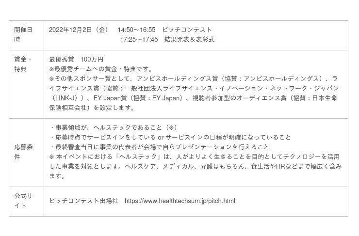 ピッチコンテストは、予防から医療・介護、食からHRまで、人がよりよく生きることをテクノロジーで実現するサービスが応募対象です。
