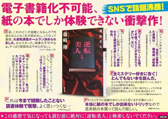 SNSを中心に話題沸騰中、ネタバレ厳禁の「紙の本でしかできない」衝撃作『逆転美人』が大好評につき、またまた大重版決定! しかも帯は『アメトーーク』の「読書芸人」出演でもおなじみの書店員芸人カモシダせぶんさんの激推しコメント付き。読書好きのみならず数々の芸人さんもそのトリックに衝撃を受けている本作、この機会にぜひあなたも衝撃体験をしてみては?