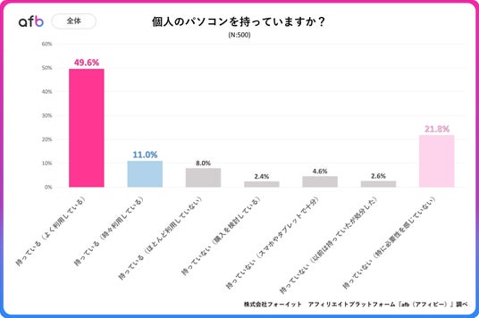 アフィリエイトプラットフォーム「afb(アフィビー)」< https://www.afi-b.com/ >の開発運用をおこなう株式会社フォーイットは、全国の20代~60代までの男女500人を対象に暮らしに関するアンケートを実施し、年代別等の特徴についてまとめました。