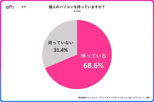 全国の20代~60代の男女を対象に、「個人のパソコンを持っていますか?」というアンケートを実施したところ、「持っている」と回答した方は68.6%でした。