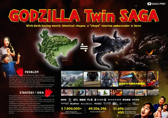 地域の産業・経済・文化スポーツに関する広告活動を通じて、日本各地の地域活性化に貢献した優れた広告コミュニケーション活動を顕彰することで、地域活性化を促進する『鈴木三郎助全広連地域広告大賞』にて、第4回となる今回、113作品の応募の中から、「ゴジラ対サガ」が最優秀賞およびキャンペーン部門賞を受賞。「かたち」という共通点に絞る大胆かつユニークな企画に振り切り、勢いとスピード感のあるコミュニケーション設計で、話題を喚起し、目標である観光客誘致という成果を大きく上げた点が高く評価された。
