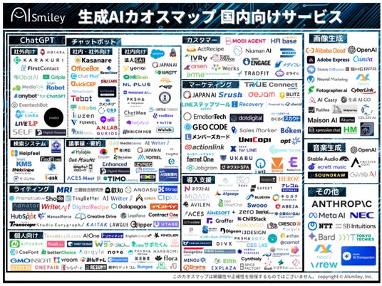 生成AIカオスマップは、生成AIサービスを「チャットボット」「カスタマー」「マーケティング」「検索システム」「画像生成」「音楽生成」など11カテゴリに分類、マッピングしております。