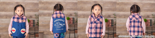 ネイビーの背面にはアンパンマンとばいきんまん、ブルーの背面にはアンパンマンとめいけんチーズ、レアチーズちゃんがプリントでデザインされています。リバーシブルなので全面チェックのデザインも楽しめ、シーンによって着こなしを変えられるアイテムです。