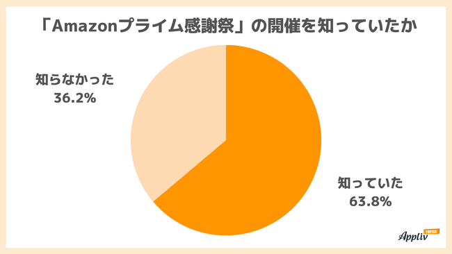 Amazonで10月14日・15日に「Amazonプライム感謝祭」を開催していたことを知っていたかを質問したところ、「知っていた」と回答したのは63.8%。過半数が「Amazonプライム感謝祭」の存在を知っていました。