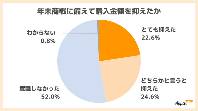 「とても抑えた」が22.6%、「どちらかと言うと抑えた」が24.6%で、年末セールを意識していたのが47.2%。一方で「意識しなかった」が52.0%で、気にしていない人の方が多い結果となりました。