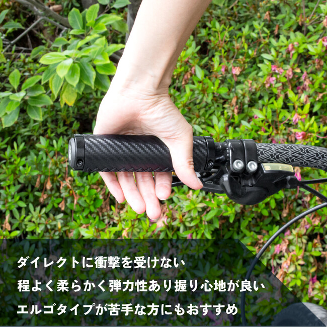 カーボン調柄が落ち着いた印象をあたえる自転車用グリップです。表面はまるで本革のようなPUレザーを採用。軽量で弾力性もありソフトな握り心地です。