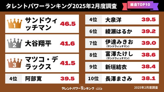 「タレントパワーランキング」2025年2月度調査(第1四半期)の総合トップ10を発表!