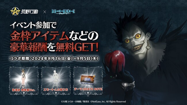 NetEase Gamesが開発・運営する大人気バトルロワイヤルゲーム『荒野行動』にて、2024年8月16日から9月5日の期間中、『DEATH NOTE』とのコラボイベントを開催いたします。