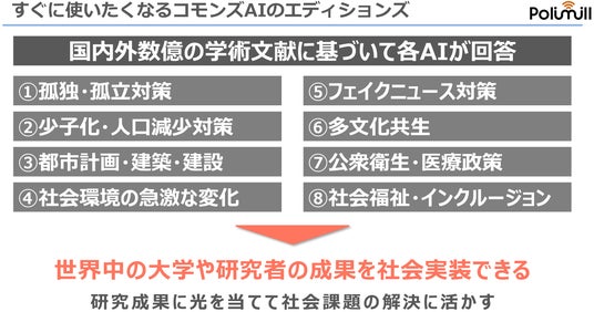 Polimill株式会社は、各専門領域で大幅に強化された行政サポート生成AI【QommonsAI】(コモンズAI)と、誰でも安心して簡単にまちづくりに参加できるSNS【Surfvote】(サーフボート)を開発・運営・提供するICTスタートアップ企業です。