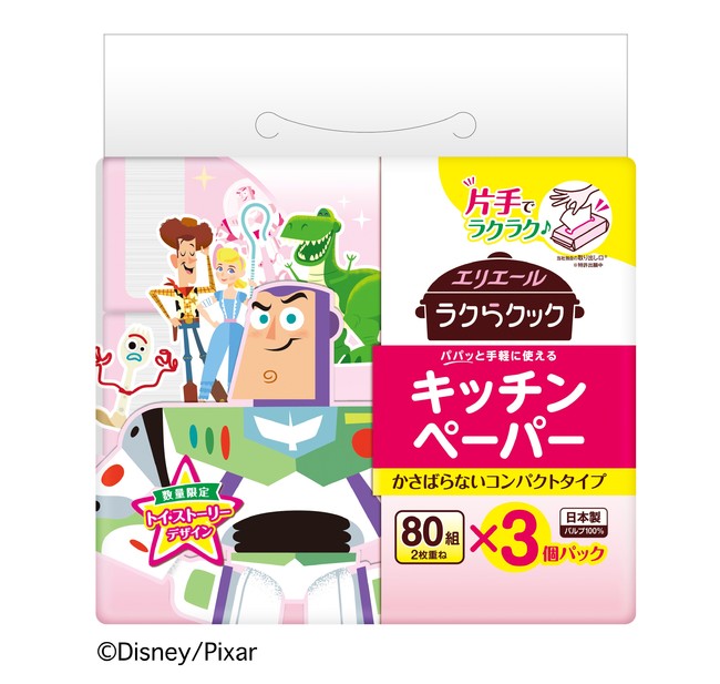 そこで、おうち時間をより明るい気持ちで過ごしていただくため、洗面まわりのお手ふきやふき掃除、キッチンまわりの調理・ふき掃除などさまざまなシーンに合わせてお使いいただける『Plus+(プラス)キレイ ペーパータオル コンパクトタイプ』と『ラクらクック パパッと手軽に使えるキッチンペーパー』から、ディズニー「トイ・ストーリー」デザインパッケージを数量限定で発売。1995年の映画公開から20年以上にわたって世代を超えて愛されている「トイ・ストーリー」の人気キャラクターを起用することで、小さなお子さまから大人まで、みなさまの衛生的で安心・快適な毎日の暮らしを応援してまいります。