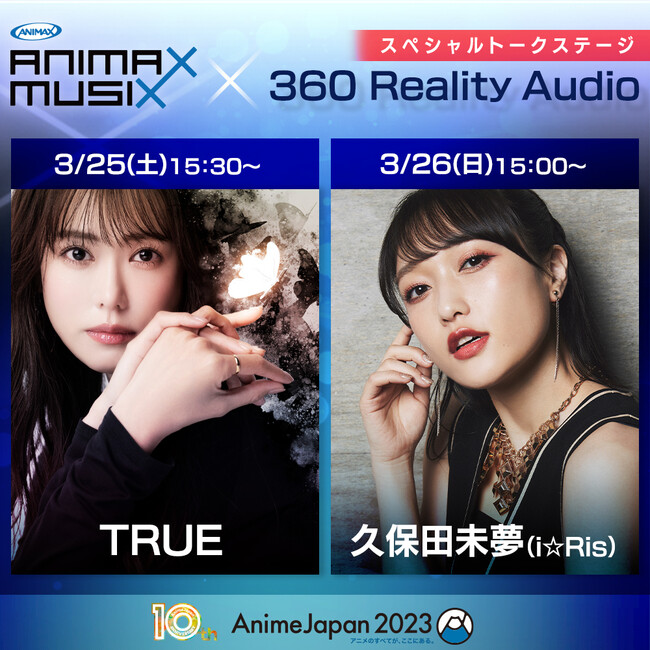 今回は、昨年11月に横浜アリーナで開催した「ANIMAX MUSIX 2022」からTRUEさん、i☆Ris久保田未夢さんを迎え、「ANIMAX MUSXI 2022」のライブ音源を 360 Reality Audio(サンロクマル・リアリティオーディオ)で体験いただきます。まるで客席から自身の歌声を聴いているかのような再現感の高いソニーの360立体音響技術と迫力のライブ映像によって、あの日のステージをリアルに再現。ファンと同じ目線でみる自身のステージを体験し、ファンと一緒にあの日のステージを振り返っていただきます。