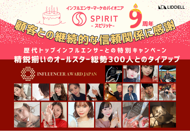 SNS・インフルエンサーマーケティング事業を展開するLIDDELL株式会社(本社:東京都港区、代表取締役:福田 晃一、以下リデル)は、インフルエンサーマッチングプラットフォーム『SPIRIT(スピリット)』9周年を記念し、歴代トップインフルエンサー(リデルが2016年から開催している『インフルエンサー・アワード・ジャパン/ IAJ 』の受賞者やノミネーター)とのスペシャルタイアップキャンペーンを展開いたします。