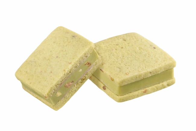 ピスタチオ風味の香ばしいサブレで、ピスタチオペーストと刻んだピスタチオを練りこんだホワイトチョコレートガナッシュをサンドしました。
