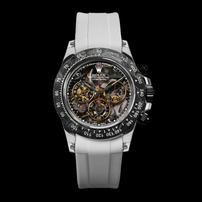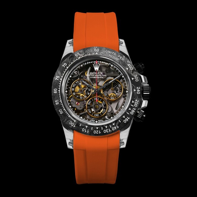 ケースを耐久性と透過性に優れたサファイアクリスタルで製作。ベゼルにはカーボンファイバーを使用。さらにダイヤルは丁寧に肉抜きされたスケルトンダイヤル。バックケースからは、専用にカスタマイズされたローターを見ることができます。