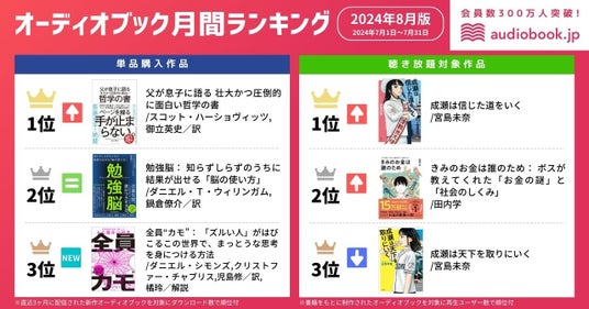 株式会社オトバンク( 本社:東京都文京区、代表取締役社長:久保田裕也、以下「オトバンク」)は、当社が運営する会員数300万人超、オーディオブック書籍ラインナップ数No.1(※1)のオーディオブック配信サービス「audiobook.jp」における、オーディオブック月間ランキング8月付(2024/7/1~7/31)を発表します。