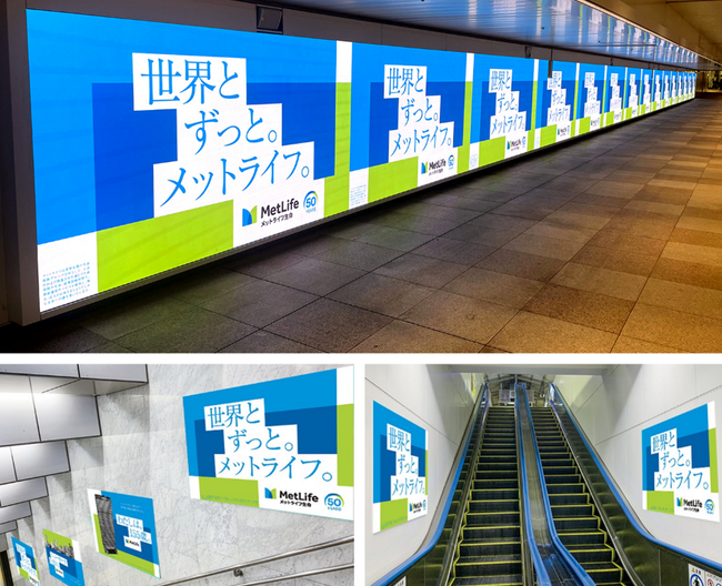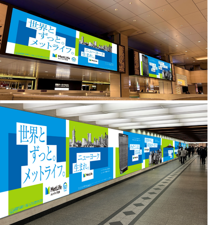 「世界とずっと。メットライフ。」をキーメッセージに掲げ、米国で 155 年、日本で 50年を迎えたグローバル企業として、長い歴史と世界観をビジュアルでお伝えすることを企図しています。世界一の乗降客数を誇るJR新宿駅をはじめ、JR品川駅、JR東京駅、阪急梅田駅、JR名古屋駅、と日々多くの方々が利用する駅構内に広告が登場します。時間や場所を制限されないインターネット広告でも、同じメッセージを発信しています。