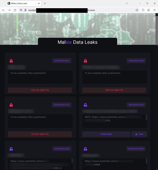図:Malloxのデータリークサイト。身代金の支払いを拒否したと思われる企業の情報が掲載されている。公開されるまでの残り時間がカウントダウンタイマーで示されている。