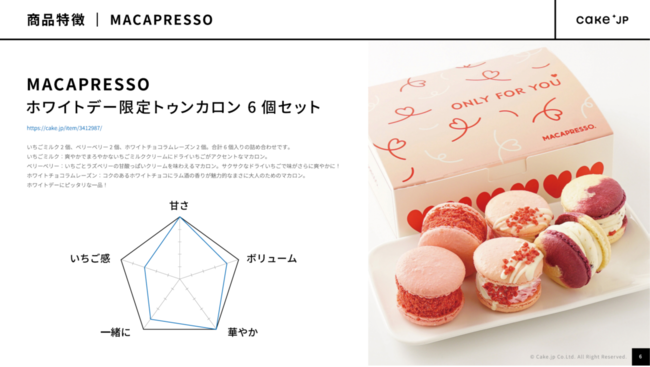 この度公開する特別資料では、旬のいちごを使ったホワイトデー限定スイーツ5つをご紹介しています。各スイーツの特長を一目で認識いただけるよう、ポジショニングマップや、「甘さ」「ボリューム」「華やかさ」「一緒に楽しめるか」「いちご感」の5つの項目のレーダーチャートを資料内に反映しています。