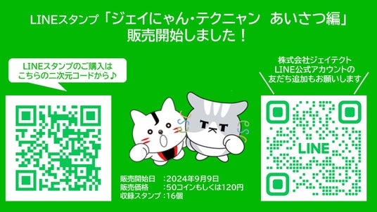 株式会社ジェイテクト(本社:愛知県刈谷市、取締役社長:近藤 禎人、以下「ジェイテクト」)は、LINEヤフー株式会社が運営するコミュニケーションアプリ「LINE」において、LINEスタンプ「ジェイにゃん・テクニャン あいさつ編」を、9月9日より販売開始しました。