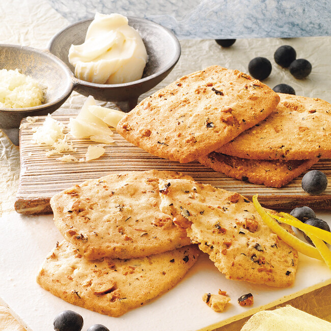 丹波黒豆を生地にブレンドし、アクセントに塩を入れた和風サブレ。生地にウォッカを加えることで、食感にかろやかさを出しました。京都府水尾のゆずを使ったゆずピールをブレンドした[ゆず]と、パルメザンチーズ・ゴーダチーズ・クリームチーズの3種をブレンドした[チーズ]の2種類のセットです。