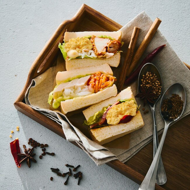 「ハウス カレーパンノヒ」の新作は、厚めに切ったふわふわもちもち食感の食パンに、スパイスやハーブが香るこだわり具材をぎっしりと挟んだボリュームのあるサンドイッチです。具材は、インドのスパイシー唐揚げであるチキン65や、インド風漬物であるアチャールなどバリエーション豊かで、全3品ともにスパイス・ハーブを活かした味わいに仕上げました。