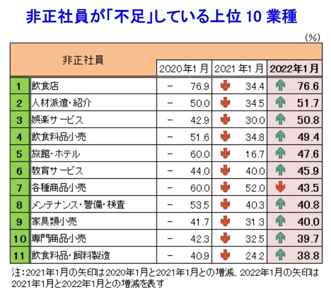 業種別にみると、「飲食店」(76.6%)は唯一7割以上の企業で非正社員が不足していると回答。「飲食店」は2021年10月調査時点で63.3%まで上昇していたが、その後も上昇傾向が継続。2022年1月は、再びまん延防止等重点措置による影響もみられ、2021年12月から1.4ポイント減となったものの、依然として高水準で推移している。企業からも「人手不足がどんどん加速している」(中華料理店)といった声があげられた。