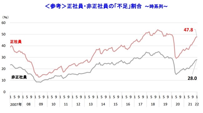■調査期間は2022年1月18日~2022年1月31日、調査対象は全国2万4,072社で、有効回答企業数は1万1,981社(回答率49.8%)。なお、雇用の過不足状況に関する調査は2006年5月より毎月実施しており、今回は2022年1月の結果をもとに取りまとめた