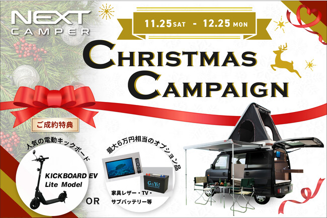 株式会社ブレイズ(愛知県名古屋市、代表取締役:市川秀幸、以下ブレイズ)は、2023年11月25日(土)~12月25日(月)の期間、軽キャンピングカーキット「NEXT CAMPER(ネクストキャンパー)」をご契約いただいたお客様に、特定小型原付「キックボードEV ライトモデル」または最大6万円相当の選べるオプションをプレゼントいたします!