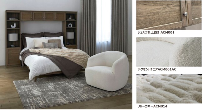 扉まわりのモールディング装飾が目を惹くシェルフ&上置きを主役にしたベッドルーム。静かなあたたかみを感じるグレージュの木色で囲んだベッドは、ほっとくつろげる空間に。デッドスペースになりがちなベッドまわりを収納や飾り棚として有効活用できます。同じシリーズのローボードと組み合わせれば、ハイボードとしてもお使いいただけます。