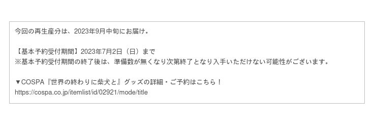 ▼COSPA『世界の終わりに柴犬と』グッズの詳細・ご予約はこちら!